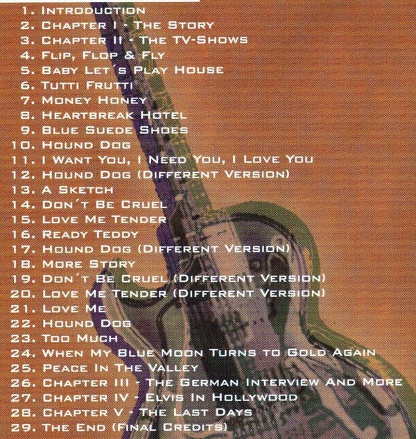 01 Introduction 02 Chapter I - The Story 03 Chapter II - The TV-Shows 04 Flip, Flop & Fly 05 Baby Let's Play House 06 Tutti Frutti 07 Money Honey 08 Heartbreak Hotel 09 Blue Suede Shoes 10 Hound Dog 11 I Want You, I Need You, I Love You 12 Hound Dog (Different Version) 13 A Sketch 14 Don't Be Cruel 15 Love Me Tender 16 Ready Teddy 17 Hound Dog (Different Version) 18 More Story 19 Don't Be Cruel (Different Version) 20 Love Me Tender (Different Version) 21 Love Me 22 Hound Dog 23 Too Much 24 When My Blue Moon Turns To Gold Again 25 Peace In The Valley 26 Chapter III - The German Interview And More 27 Chapter IV - Elvis In Hollywood 28 Chapter V - The Last Days 29 The End (Final Credits)